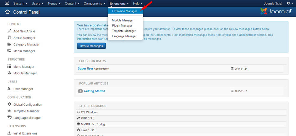 Login to the Administration Control Panel of your Joomla website and navigate to Extensions >> Install / Uninstall.