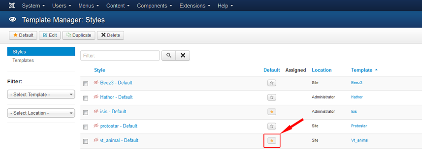 Now navigate to Extensions >> Template Manager. You will see a list of templates installed on your Joomla website. Click the radio button to the left of the template you wish to use. Next click the "Default" icon at the top right of the page. This will append your installed template to the Joomla website.